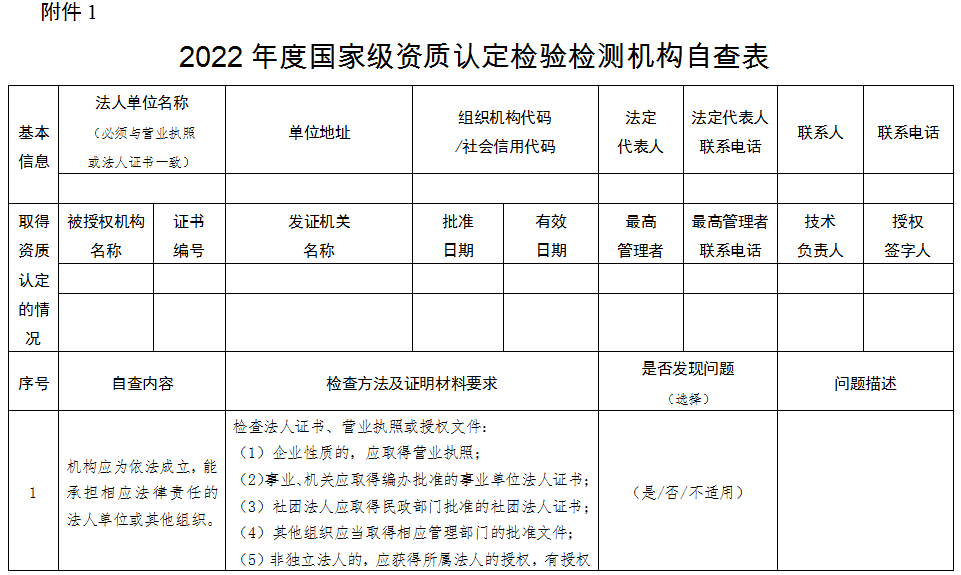 四、推动检验检测机构开展风险自查自纠工作 检验检测机构要认真落实主体责任,扎实开展自查自纠,深入排查风险隐患,系统做好风险分析,并采取针对性措施有效预防、规避和降低风险。自查的重点为:检验检测活动是否符合国家相关法律法规的规定,遵循客观独立、公平公正、诚实信用原则;检验检测数据、结果是否真实、客观、准确;管理体系是否有效运行,是否能够持续符合资质认定条件和要求;从事检验检测活动所必需的检验检测设备设施是否完备;是否遵守反垄断法等相关法律规定,依法合规开展生产经营等。 市场监管总局制定了《2022年度国家级资质认定检验检测机构自查表》(详见附件1),各国家级资质认定检验检测机构应于2022年9月15日前完成自查和整改,并上报自查情况。检验检测机构可登录http://47.94.146.244/下载、上传电子版自查表。 省级资质认定检验检测机构应按照各省级市场监管部门要求完成自查、整改工作。